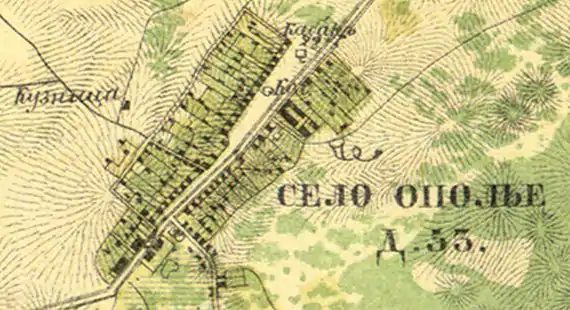 ОПОЛЬЕ — деревня графа Шувалова, по почтовой дороге, число дворов — 65, число душ — 134 м. п. (1856 год)[10]