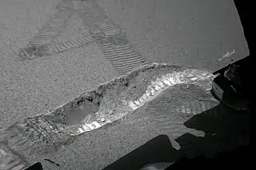 Траншея, выкопанная ровером, стала первой в истории исследований Марса. Она достигает приблизительно 50 сантиметров в длину и 10 сантиметров в глубину. «Это намного глубже, чем я ожидал», — сказал доктор Роб Салливан из Корнеллского университета, Итака, штат Нью-Йорк, научный член команды, работающей в тесном сотрудничестве с инженерами над задачей выкапывания траншеи[38].