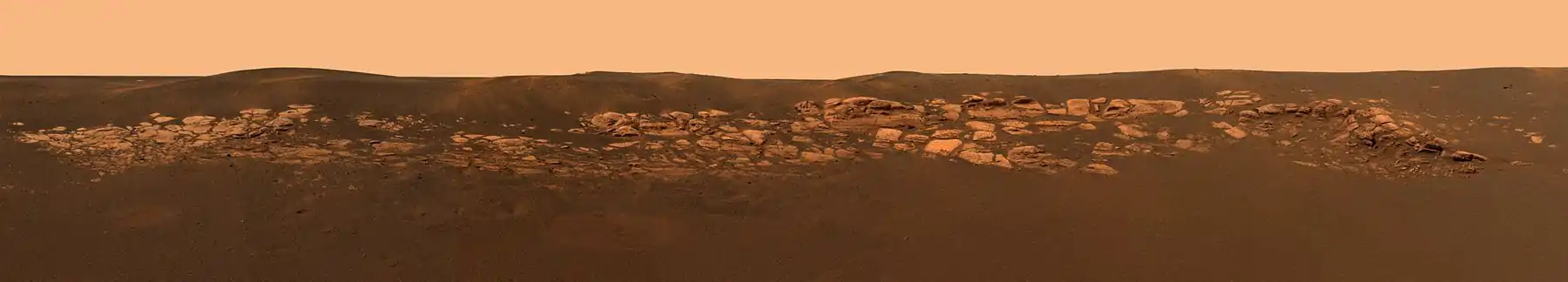 Учёные были заинтригованы изобилием обнажений горных пород, разбросанных по кратеру, а также самим его грунтом, который, казалось, был смесью грубых красновато-серых «зёрен». Этот кадр с необычным горным обнажением рядом с «Оппортьюнити» был снят панорамной камерой ровера. Учёные полагают, что слоистые камни на фото — залежи вулканического пепла или отложения, созданные ветром или водой. Горные обнажения назвали «Выступом Оппортьюнити».