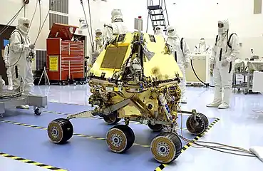 ![]() Заключительная проверка работоспособности всех систем «Оппортьюнити» перед «упаковыванием» в спускаемый аппарат, 24 марта 2003 года | |