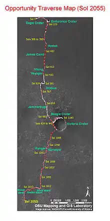 «Оппортью́нити» (англ. Opportunity, МФА: [ˌɑː.pɚˈtuː.nə.ti] — «благоприятная возможность»), или MER-B (сокр. от Mars Exploration Rover — B') — второй марсоход космического агентства НАСА из двух, запущенных США в рамках проекта Mars Exploration Rover. Был выведен с помощью ракеты-носителя Дельта-2 7 июля 2003 года[7]. Он достиг поверхности Марса 25 января 2004 года, тремя неделями позже первого марсохода «Спирит», успешно доставленного в другой район Марса, смещённый по долготе примерно на 180 градусов[8]. «Оппортьюнити» совершил посадку в кратере Игл, на плато Меридиана.