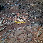 | Обнажение горных пород, снимок микрокамеры (MI) ровера | Тонкие пласты горных пород, не совсем параллельные друг другу | Отверстие в скале, сделанное с помощью «RAT» | Пустоты в скале |