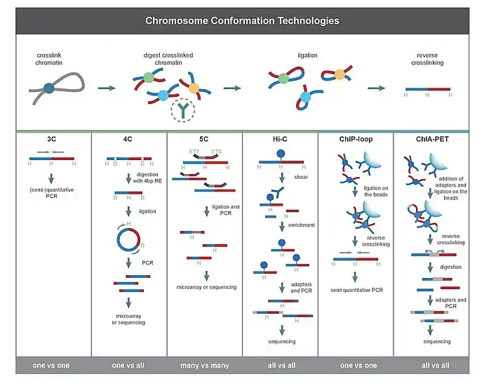 Метод захвата конформации хромосомы (англ. chromosome conformation capture, 3C) необходим для количественного определения взаимодействия между выбранной парой геномных локусов. Например, 3C можно использовать для изучения потенциального взаимодействия промотор-энхансер. Лигированные фрагменты детектируют с помощью ПЦР, используя праймеры к известным последовательностям[10][2].