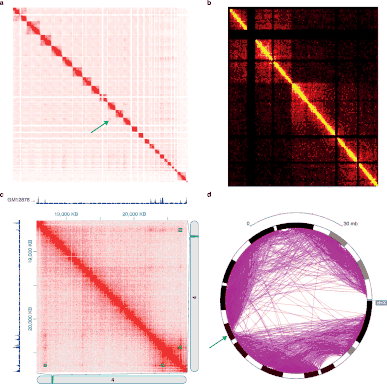 Данные Hi-C часто используются в анализе уровней полногеномной организации хроматина. В результате обработки существующими алгоритмами выделяются ТАДы, протяжённые линейные участки генома, которые связаны пространственно[45][35][6].