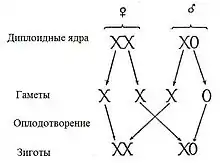 | Сферокарпус (Sphaerocarpus) | Отдел Печёночные мхи (Marchantiophyta) | Мужской гаметофит 7А + Y, женский 7A + X. После оплодотворения зигота и развивающийся из неё диплоидный спорофит содержит 14А + XY или 14А + XX у мужских и женских особей соответственно[80]. | |
