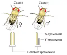 XY-определение пола является наиболее распространённым; такая система определения пола работает у человека, также как и у подавляющего большинства млекопитающих. В этой системе женские особи имеют две одинаковые половые хромосомы XX, а у мужских имеется две различные половые хромосомы X и Y. Пара половых хромосом XY не похожи друг на друга по форме, размеру и генному составу, что отличает их от пар аутосомных гомологов. Половые хромосомы X и Y носят также название «гоносомы». У некоторых видов, в том числе и человека, на Y-хромосоме имеется ген SRY, определяющий мужское начало. У других, например, плодовой мушки (Drosophila melanogaster) пол зависит от соотношения числа Х-хромосом (Х) и наборов аутосом (А). Если оно равно 1, из неё развивается самка, если 0,5 — самец. При промежуточном соотношении (0,67) развиваются интерсексы — нечто среднее между самцами и самками. При соотношении > 1 развиваются метасамки (сверхсамки), при соотношении < 0,5 — метасамцы (сверхсамцы). И сверхсамцы, и сверхсамки слабы и рано погибают. При этом Y-хромосома роли в определении пола не играет, но она необходима для образования спермы[24].