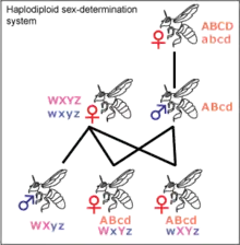 Сущность гаплоидиплоидности заключается в том, что генотипы самцов и самок различаются на геномном, а не хромосомном, уровне: гаплоидный организм развивается в самца, а диплоидный — в самку[45]. Гаплодиплоидность встречается у насекомых отряда Перепончатокрылые (Hymenoptera), например, муравьёв и пчёл. Неоплодотворённые яйца развиваются в гаплоидных самцов[45]. Диплоидные особи, развивающиеся из оплодотворённых яиц, как правило, являются самками[45], но могут быть и стерильными самцами. У самцов не может быть отцов и сыновей. Если пчелиная матка спаривается с одним трутнем, её дочери имеют ¾ общих генов, а не ½, как в XY- и ZW-системах. Предполагается, что это имеет важное значение для развития эусоциальности, поскольку это увеличивает роль кин-отбора, но такая точка зрения оспаривается[46]. Большинство самок перепончатокрылых могут выбирать пол своих потомков, сохраняя полученную сперму в сперматеке и выпуская или не выпуская её в яйцевод. Это позволяет им создавать больше рабочих особей в зависимости от состояния колонии[47].