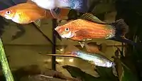 | Зелёный меченосец (Xiphophorus hellerii) | ![]() | Класс Лучепёрые рыбы (Actinopterygii), отряд Карпозубообразные (Cyprinodontiformes) | Способны менять пол. Присутствие более развитого самца вызывает созревание самок и подавляет созревание молодых самцов вблизи него[59][60]. |