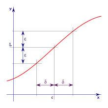 Определение предела в терминах и («эпсилон–дельта-определение предела») — это формализация понятия предела. Концепция принадлежит Огюстену Луи Коши, который никогда не давал формальное определение предела в терминах и в своём труде Cours d'Analyse, хотя использовал время от времени и в доказательствах. Первым дал формальное определение Бернард Больцано в 1817 году, а современную формулировку, в конечном счёте, дал Карл Вейерштрасс[1][2]. Он дал точную формулировку следующему неформальному определению: зависимое выражение стремится к значению L при стремлении переменной x к значению c, если значение можно сделать как угодно близким к значению L путём выбора x достаточно близко к c.