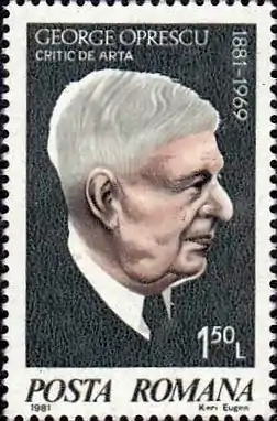 ![]() Почтовая марка Румынии 1981 года, посвященная 100-летию со дня рождения Дж. Опреску | |