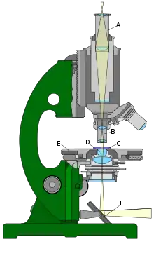 Конденсор (от лат. condense — сгущаю, уплотняю), короткофокусная линза или система линз, используемая в оптическом приборе для освещения рассматриваемого или проецируемого предмета. Конденсор собирает и направляет на предмет лучи от источника света, в том числе и такие, которые в его отсутствие проходят мимо предмета; в результате такого «сгущения» светового потока резко возрастает освещённость предмета. Конденсоры применяются в микроскопах, в спектральных приборах, в проекционных аппаратах различных типов (например, диаскопах, эпидиаскопах, фотографических увеличителях и т. д.). Конструкция конденсора тем сложнее, чем больше его апертура. При числовых апертурах до 0,1 применяют простые линзы; при апертурах 0,2—0,3— двухлинзовые конденсоры, выше 0,7—трёхлинзовые. Наиболее распространён конденсор из двух одинаковых плосковыпуклых линз, которые обращены друг к другу сферическими поверхностями для уменьшения сферической аберрации. Иногда поверхности линз конденсора имеют более сложную форму — параболоидальную, эллипсоидальную и т. д. Разрешающая способность микроскопа повышается с увеличением апертуры его конденсора, поэтому конденсоры микроскопов — обычно сложные двух- или трёхлинзовые системы. В микроскопах и кинопроекционных аппаратах широко применяют также зеркальные и зеркально-линзовые конденсоры, апертура которых может быть очень велика — угол 2u раствора собираемого пучка лучей достигает 240°. Часто наличие в конденсорах нескольких линз вызвано не только стремлением увеличить его апертуру, но и необходимостью однородного освещения предмета при неоднородной структуре источника света[5].