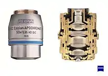 - Через дробь от увеличения указывается числовая апертура — характеристика разрешающей способности объектива. Предельная разрешающая способность объектива в мкм , где λ — длина волны света, мкм; А — числовая апертура. Лучшие объективы имеют апертуру 1,4 и разрешение 0,12 мкм. Оценочно считают что максимальное разумное увеличение микроскопа при наблюдении глазом ограничено величиной апертуры умноженной на 1000. С другой стороны, чем больше апертура тем меньше глубина резкости (глубина зрения)[7]. Иногда объектив снабжается регулируемой диафрагмой, изменяющей числовую апертуру (такие объективы маркируются I, Iris).