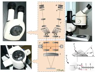 Изображение, сформированное объективом, может быть непосредственно подано в окуляр или разделено на несколько идентичных изображений. Микроскопы без деления называются монокулярными, в них смотрят одним глазом. Удобство наблюдения двумя глазами предопределило широкое распространение бинокулярных микроскопов с двумя идентичными окулярами. Кроме того, микроскоп может оснащаться фотоаппаратурой, которая может монтироваться либо вместо штатных окуляров, либо в отдельный оптический порт. Такие микроскопы именуются тринокулярными.