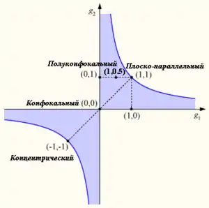 - Полуконцентрический (). Образован одним сферическим зеркалом и одним плоским, по своим свойствам близок к концентрическому резонатору.