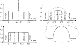 Многомодовые волокна подразделяются на ступенчатые и градиентные. В ступенчатых волокнах показатель преломления от оболочки к сердцевине изменяется скачкообразно. В градиентных волокнах это изменение происходит иначе — показатель преломления сердцевины плавно возрастает от края к центру. Это приводит к явлению рефракции в сердцевине, благодаря чему снижается влияние дисперсии на искажение оптического импульса. Профиль показателя преломления градиентного волокна может быть параболическим, треугольным, ломаным и так далее.