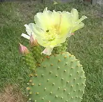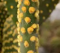 ![]() Разновидность белоколючковая Два основных отличия этой разновидности — белоснежный цвет глохидий и меньший размер члеников (3—5 сантиметров в длину, 2—4 сантиметра в ширину), и, следовательно, меньший размер куста опунции. Старое растение достигает в высоту 30—50 сантиметров. Формирует новые членики чаще жёлтой разновидности. |
