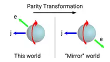 27Co — ядра таким образом, что . Поскольку и распад сохраняет угловой момент, то из следует, что [27]. Таким образом, концентрация бета-лучей в отрицательном направлении z указала на появление левых кварков и электронов. Из таких экспериментов, как опыт Ву и опыт Гольдхабера, было показано, что безмассовые нейтрино должны быть левыми, а безмассовые антинейтрино должны быть правыми[28]. Поскольку в настоящее время известно, что нейтрино имеют небольшую массу, было высказано предположение, что правые нейтрино и левые антинейтрино могут также существовать. Эти нейтрино не будут взаимодействовать с лагранжианом слабого взаимодействия и будут участвовать только в гравитационном взаимодействии, возможно, образуя часть тёмной материи во Вселенной[29].