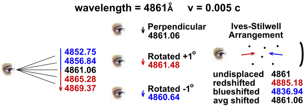 При инвертации этих соотношений так, чтобы они относились к длинам волн, а не к частотам, «классическая теория» предсказывает значения длин волн с красным и синим смещением 1 + v/c и 1 − v/c, поэтому, если все три длины волны (смещенные в красную, синюю и исходную) маркируются на линейной шкале, согласно классической теории, три метки должны располагаться идеально равномерно: