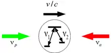 где — частота лазерного луча, распространяющегося антипараллельно ионному лучу, и — частота лазерного луча, распространяющегося параллельно ионному пучку. и — частоты переходов в состоянии покоя. , — скорость ионов и — скорость света. В случае спектроскопии насыщения формула меняется на