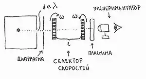 В опыте используется ящик с газом, молекулы которого вылетают через отверстие наружу. Диаметр отверстия много меньше длины свободного пробега молекул, молекул в ящике много, так что исчезновение вылетающих не меняет имеющееся распределение по скоростям внутри ящика. Колёса селектора, на поверхности которых находятся выступы, пропускающие или останавливающие летящие молекулы, вращаются с угловой скоростью . Так, преодолев первое колесо, молекула летит расстояние до второго, которое за это время поворачивается на угол . Выполняется соотношение: