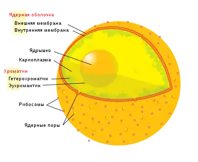 Ядерный аппарат — область клетки, содержащая специализированные компоненты, способствующие хранению и реализации генетического материала[6][7]. Ядро эукариот состоит из двумембранной ядерной оболочки, хроматина, ядрышка, матрикса и кариоплазмы[7]. В некоторых местах ядерной оболочки мембраны смыкаются, образуя ядерные поры — участки оболочки, содержащие сложные комплексы белковых молекул, осуществляющих транспорт веществ[8]. У прокариот имеется аналог клеточного ядра — нуклеоид, или нуклеоплазма. Зона нуклеоида, в отличие от клеточного ядра, не отделена от цитоплазмы оболочкой и содержит рибосомы, различные граны и мембраны[9].