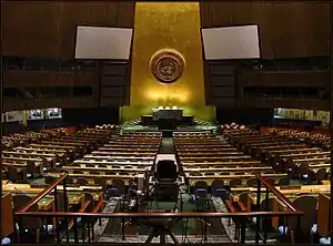 Организа́ция Объединённых На́ций (ОО́Н) — международная организация, созданная для поддержания и укрепления международного мира и безопасности, а также развития сотрудничества между государствами. ООН считается универсальным форумом, наделённым уникальной легитимностью, несущей конструкцией международной системы коллективной безопасности, главным элементом современной многосторонней дипломатии[12]. Штаб-квартира ООН находится в Нью-Йорке; у ООН также есть дополнительные офисы в Вене, Женеве и Найроби. Международный суд ООН находится в Гааге.