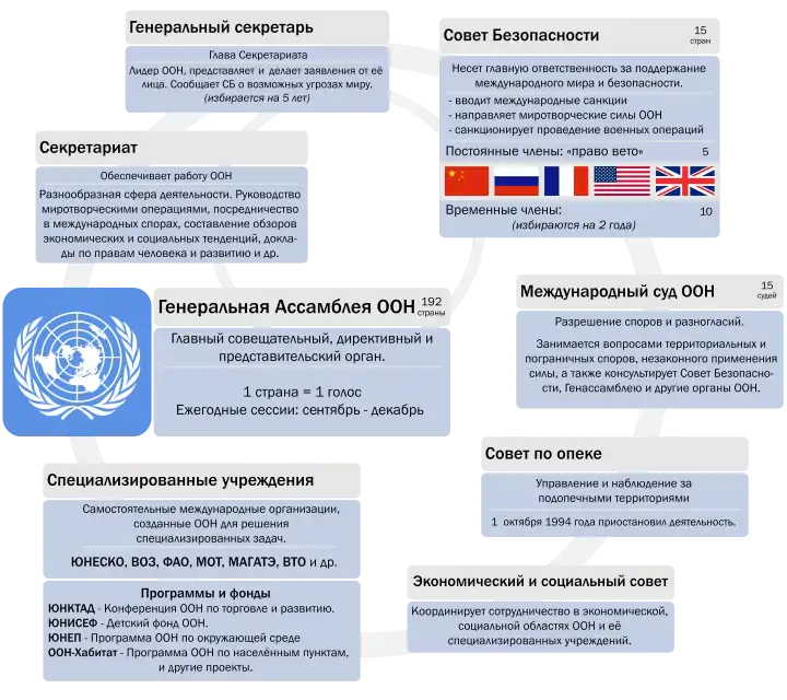 В структуру ООН входят шесть основных органов: Генеральная Ассамблея, Совет Безопасности, Экономический и Социальный Совет (ЭКОСОС), Совет по опеке, Международный суд ООН и Секретариат ООН. В рамках более широкой системы ООН работает ряд специализированных международных агентств, фондов и программ, в том числе Группа Всемирного банка, Всемирная организация здравоохранения, Всемирная продовольственная программа, ЮНЕСКО и ЮНИСЕФ. Главным административным должностным лицом ООН является Генеральный секретарь ООН; с 2017 года этот пост занимает португальский дипломат Антониу Гутерриш.