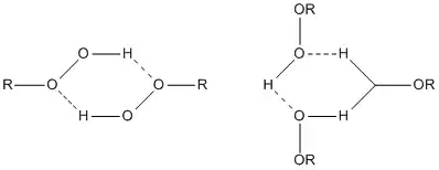 Полярность связи O−H приводит к тому, что органические гидропероксиды способны образовывать внутри- и межмолекулярные водородные связи. В частности, в растворах гидропероксиды могут образовывать димеры и тримеры: