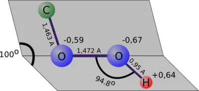 В гидропероксидах углеводородный радикал (алкильный, алкенильный, арильный и др.) соединён с гидропероксидной группой OOH, которая определяет физические и химические свойства гидропероксидов. Прочность связи O−O ~160-200 кДж/моль уступает прочности связей O−H (~480 кДж/моль), O−C (~380 кДж/моль) и сопоставима с прочностью связи O−N (~155 кДж/моль), что указывает на её высокую реакционную способность. Каждый атом кислорода пероксидной группы имеет по неподелённой электронной паре, которые отталкиваются друг от друга и взаимодействуют с электронными облаками соседних групп, образуя неплоскую конфигурацию R−O−O−H. Так, в молекуле трет-бутилгидропероксида угол O−O−H составляет 100°, длина связи C−O 1,463 Å, длина связи O−O 1,472 Å. Неподелённые электронные пары атомов кислорода способны образовывать комплексы с катионами и электрофильными веществами, и в то же время гидропероксидная группа сама является слабым электрофильным агентом.