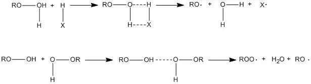 где HX — алканы, алкены, амины, спирты и др. Так, при малых концентрациях гидропероксидов их распад протекает по кинетическому уравнению первого порядка, при повышении концентрации — по уравнению второго порядка.