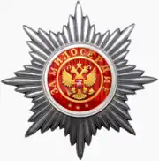 Орден «За заслуги перед Отечеством» — общегражданская награда, которой награждаются граждане Российской Федерации за особо выдающиеся заслуги, связанные с укреплением российской государственности, социально-экономическим развитием страны, научно-исследовательской деятельностью, развитием культуры и искусства, выдающимися спортивными достижениями, укреплением мира, дружбы и сотрудничества между народами, за значительный вклад в укрепление обороноспособности страны. Девиз ордена «Польза, честь и слава» повторяет девиз императорского ордена Святого Владимира. Орден «За заслуги перед Отечеством» имеет четыре степени (с I по IV, первая — наивысшая), присуждаемые последовательно. Лица, награждённые орденом III и IV степени носят только нагрудный знак, награждённые орденом I и II степени носят нагрудный знак и звезду. Военнослужащим за отличия в боевых действиях вручается орден с изображением мечей. |