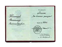 Первое награждение орденом было произведено 31 декабря 1994 года: президент России Б. Н. Ельцин подписал указ о награждении 18 военнослужащих за выполнение специальных задач в Чечне. Знак ордена за № 1 был вручён генерал-лейтенанту А. А. Романову, в тот период времени занимавшему должность командующего Объединённой группировкой федеральных войск в Чечне[7][16].