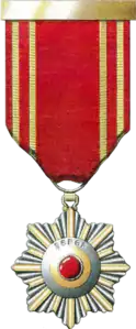 - для ношения на груди: лента тёмно-красного цвета с параллельными жёлтыми линиями (25 мм x 50 мм) и орден (35 мм х 35 мм).