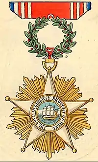 Реверс знака аналогичен аверсу за исключением центрального медальона с синей каймой, в который вписан герб Либерии. На кайме надпись «The love of freedom brought us here» (Любовь к свободе привела нас сюда).