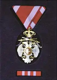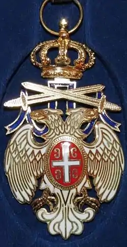 Знак ордена — золотая плоская фигурка двуглавого орла белой эмали с прорисовкой золотом деталей голов, лап, перьев. На груди орла овальный медальон с красной эмали с прямым крестом белой эмали и изображениями золотых геральдических огнив по сторонам от него. За головами орла лента синей эмали, на которую наложены два перекрещенных золотых меча. Лента крепится к золотой королевской короне.