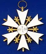 Крест — серебряный позолоченный шестиконечный, с раздвоенными концами, покрытый белой эмалью с обеих сторон. В центре каждого раздвоения на концах креста — короткие двуграные остроконечные штралы. Между лучами креста — двуграные остроконечные штралы с перекрестьями на концах. В центре лицевой стороны креста — наложенная на розетку шестиконечная звезда белой эмали. В центре оборотной стороны — круглый, с позолоченным ободком, медальон белой эмали, на котором золотом нанесена дата учреждения ордена «19 7X 36». Диаметр креста — 65 мм.