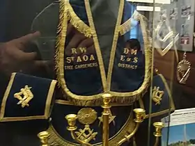 - Короткие, с полукруглым клапаном, почти аналогичны запонам масонов Шотландии. Имя президента вышито буквами P, G, H, E, инициалами Фисона, Гихона, Хиддекеля (Тигра) и Евфрата (четырех рек Едемского сада) и A, N, S — инициалами Адама, Ноя и Соломона, к которым добавлена буква О — «Оливковый».