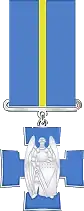 Размер креста ордена между противоположными его концами — 36 мм. Крест ордена с помощью кольца и ушка соединяется с прямоугольной колодкой, обтянутой шёлковой муаровой лентой голубого цвета с жёлтой продольной полоской посередине. Ширина ленты — 28 мм, ширина полоски — 3 мм. Размер колодки: высота — 45 мм, ширина — 28 мм. На обратной стороне колодки — застёжка для крепления знака ордена к одежде.