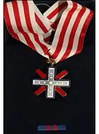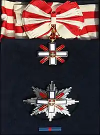 Знак ордена – золотой прямой крест белой эмали с каймой синей эмали и золотым бортиком наложенный на косой крест красной эмали с золотым бортиком и обременённый двумя золотыми мечами. В центре креста геральдический щит красной эмали с крестом белой эмали и золотыми геральдическими огнивами по сторонам от него.