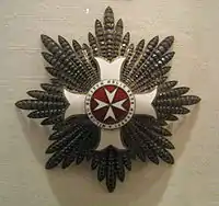 - Знаки: крест с мечами, носимый на груди на узкой ленте с наложенным гербом Мальтийского ордена.