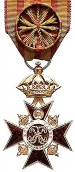 Крест увенчан королевской короной, имеющей в верхней части ушко с кольцом, через которое пропускается орденская лента. Знаки кавалеров — серебряные, остальных степеней — золотые.