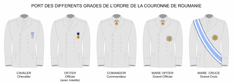 Первые две степени ордена Румынской Короны вручались вместе с восьмиконечной звездой, которую носили на груди с левой стороны.