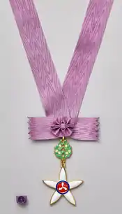 Знак ордена подвешен на светло-фиолетовом банте с розеткой из ленты муарового шелка[1].