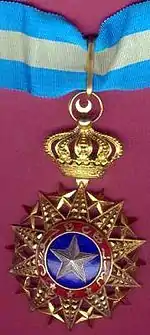 Знак ордена представляет собой серебряную десятиконечную звезду с «алмазной» огранкой. Между лучами звезды расположены позолоченные пятиконечные звёздочки. В центральном позолоченном круглом медальоне синей эмали с широким ободком красной эмали — большая выпуклая пятиконечная звезда. На ободке начертано название ордена на арабском языке и три звёздочки. Оборотная сторона звезды гладкая без изображений. К верхнему лучу звезды крепится серебряная корона, увенчанная золотым полумесяцем. Посредством кольца, проходящего через шар короны, знак крепится к орденской ленте. Знаки старших степеней могут быть полностью позолоченные.