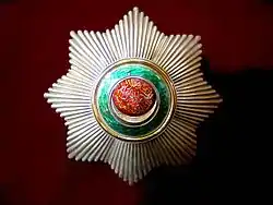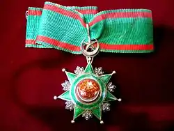 Знак ордена — семиконечная серебряная звезда темно-зелёной эмали, с тремя серебряными короткими лучами между каждыми концами звезды. Золотой центральный медальон покрыт красной эмалью и окружен кольцом зелёной эмали.
