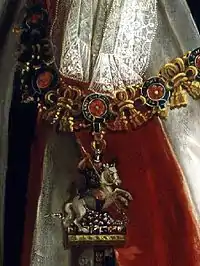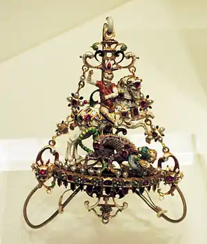 Английский орден Подвязки, основанный в 1348 году королём Эдуардом III, во 2-й половине XV века при короле Генрихе VII получил знак ордена в виде подвески с изображением святого Георгия и дракона (дополнительно к более раннему знаку — матерчатой ленте-подвязке). Хранящаяся в Оружейной палате драгоценность с изображением аналогичного сюжета долгое время считалась именно таким предметом[1].