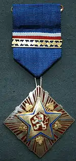 Знак ордена представляет собой прямоугольный ромб красной эмали, сторона которого равна 40 мм. В центре знака позолоченная с контуром синей эмали пятиконечная звезда в центре которой помещён государственный герб ЧССР в цветных эмалях. между лучей звезды помещены золотые трилистники. От звезды исходит сияние в виде серебряных лучей, десять из которых крупнее других, при этом четыре из которых выступают за край знака.