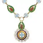 Цепь ордена состоит из звеньев в виде креста голубой эмали в белом круге и пламени красной эмали в лавровом венке зелёной эмали.