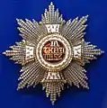 Звезда ордена восьмиконечная, шитая из серебряных нитей, позже серебряная, на звезду наложен крест, на медальоне которого помещен девиз ордена.