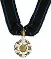 Лента ордена выполнена из муарового шелка чёрного цвета с тёмно-синими полосами, расположенными ближе к краю. Диаметр звезды — 88,5 на 88,5 мм.